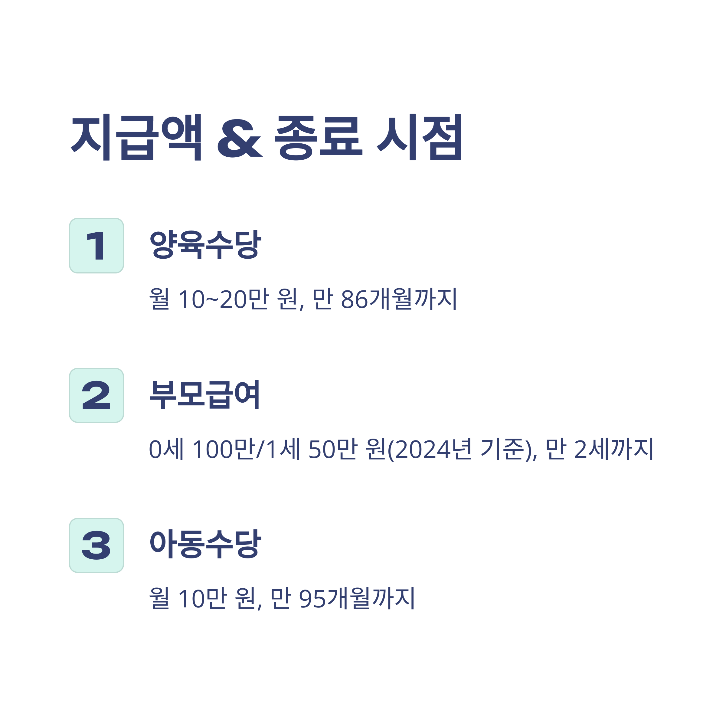 양육수당은 만 86개월, 부모급여는 만 2세, 아동수당은 만 95개월까지로 각각 종료 시점이 다릅니다. 각 정책별 최신 정보와 신청 방법은 정부24와 복지로에서 꼭 확인하세요.
