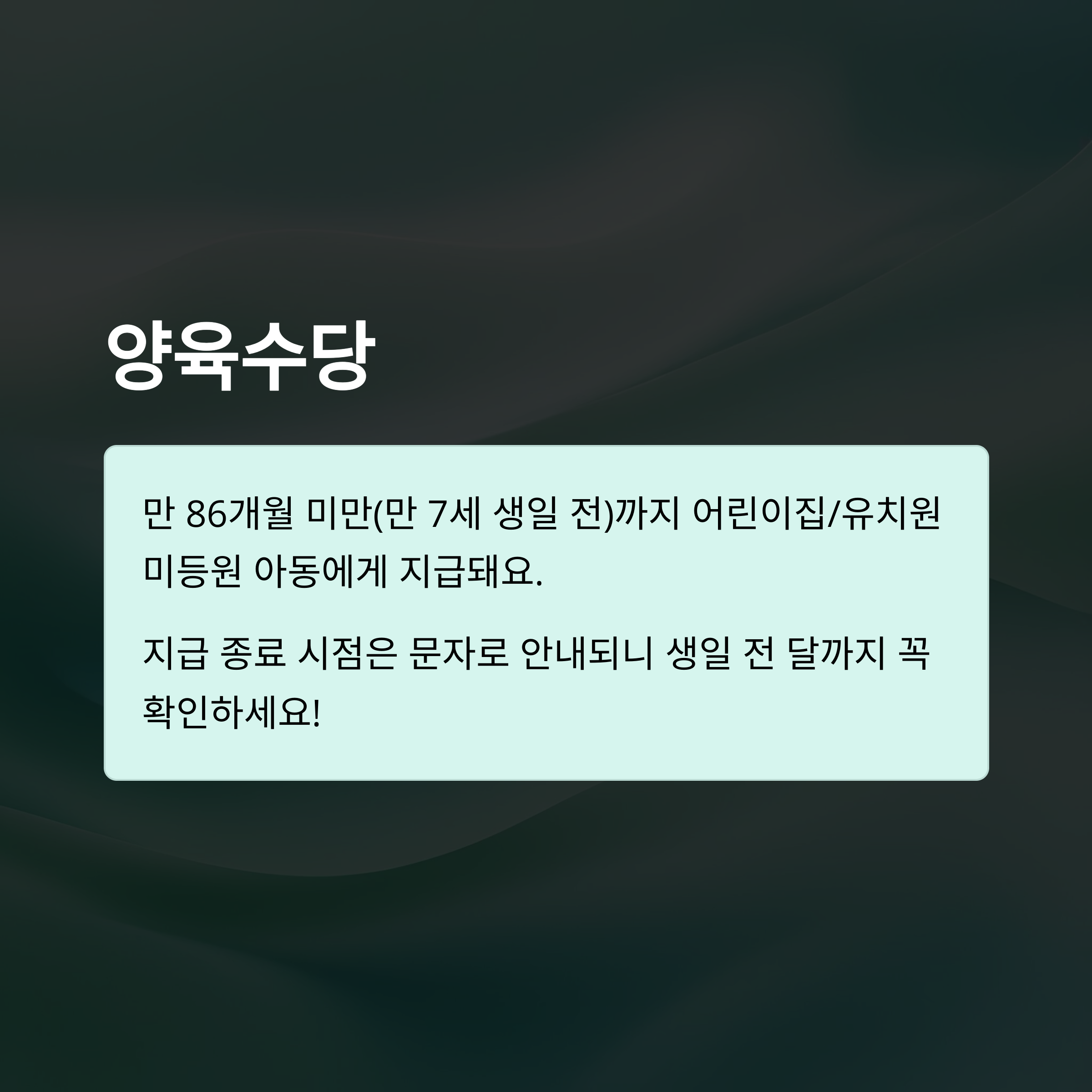 - 양육수당: 만 86개월 미만 미등원 아동에게 지급