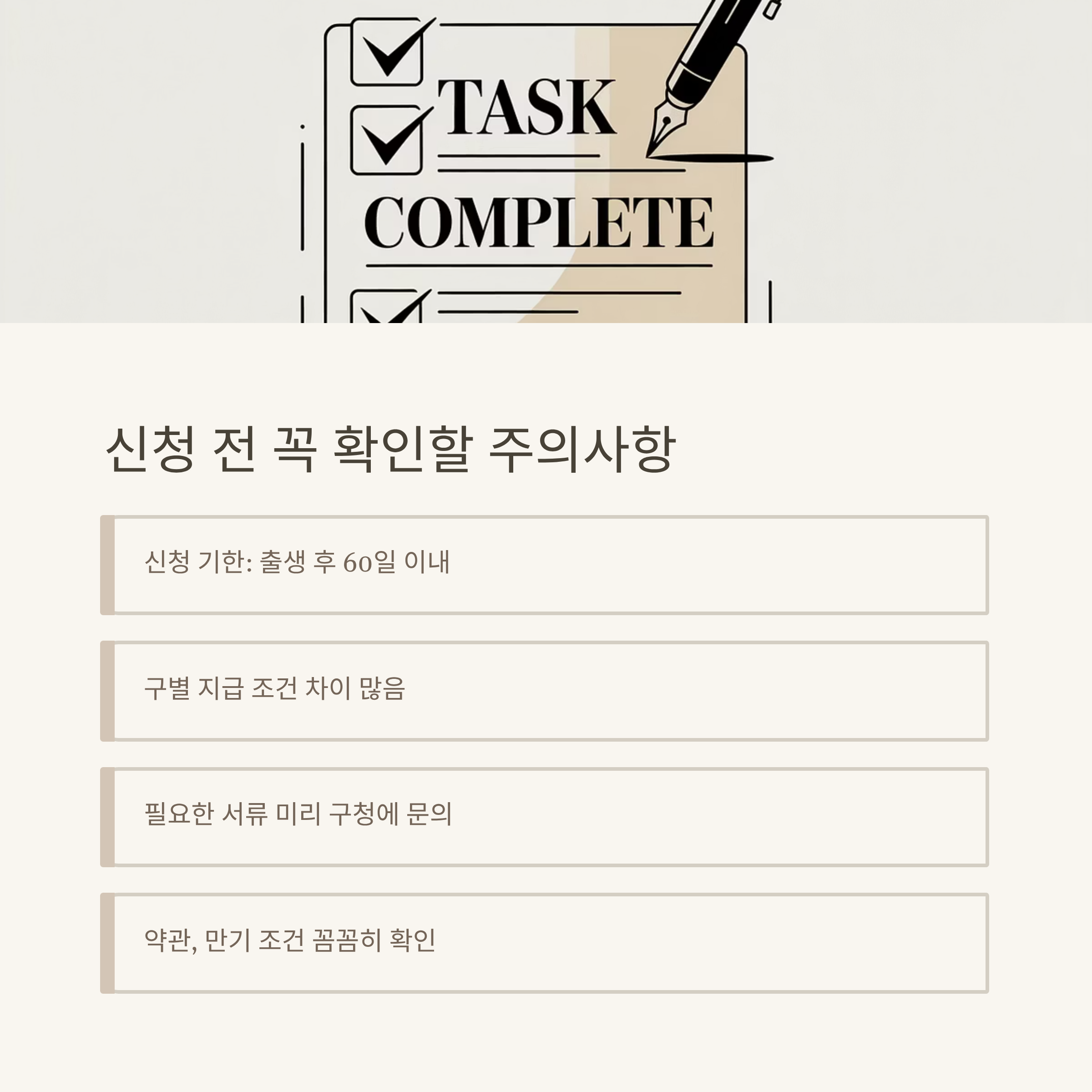 | 현금/바우처 | 출생증명서, 신분증, 통장사본 | 60일 내 신청, 구별 기준 상이 |
