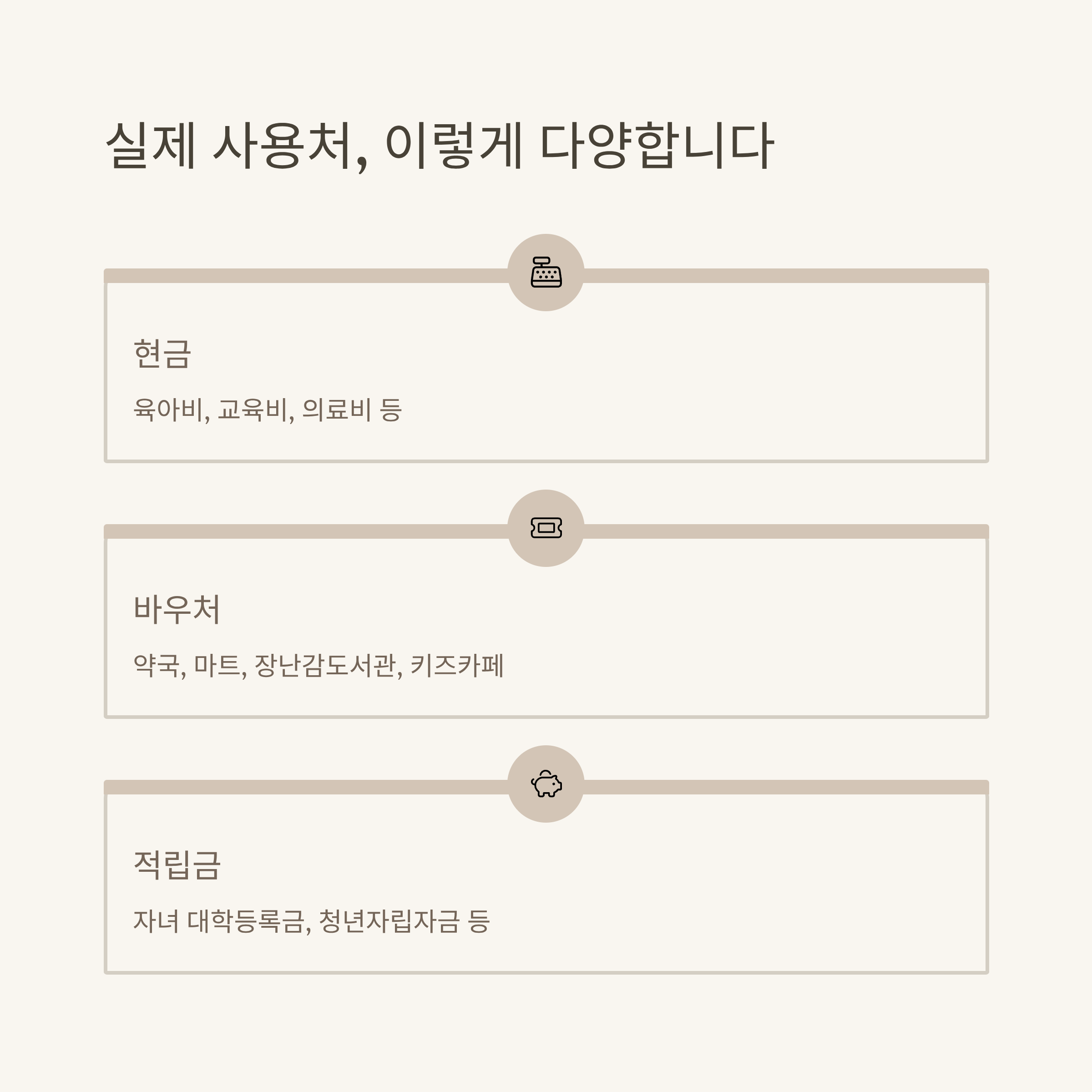 | 지급방식 | 현금, 바우처, 보험·펀드 적립형 혼합 |