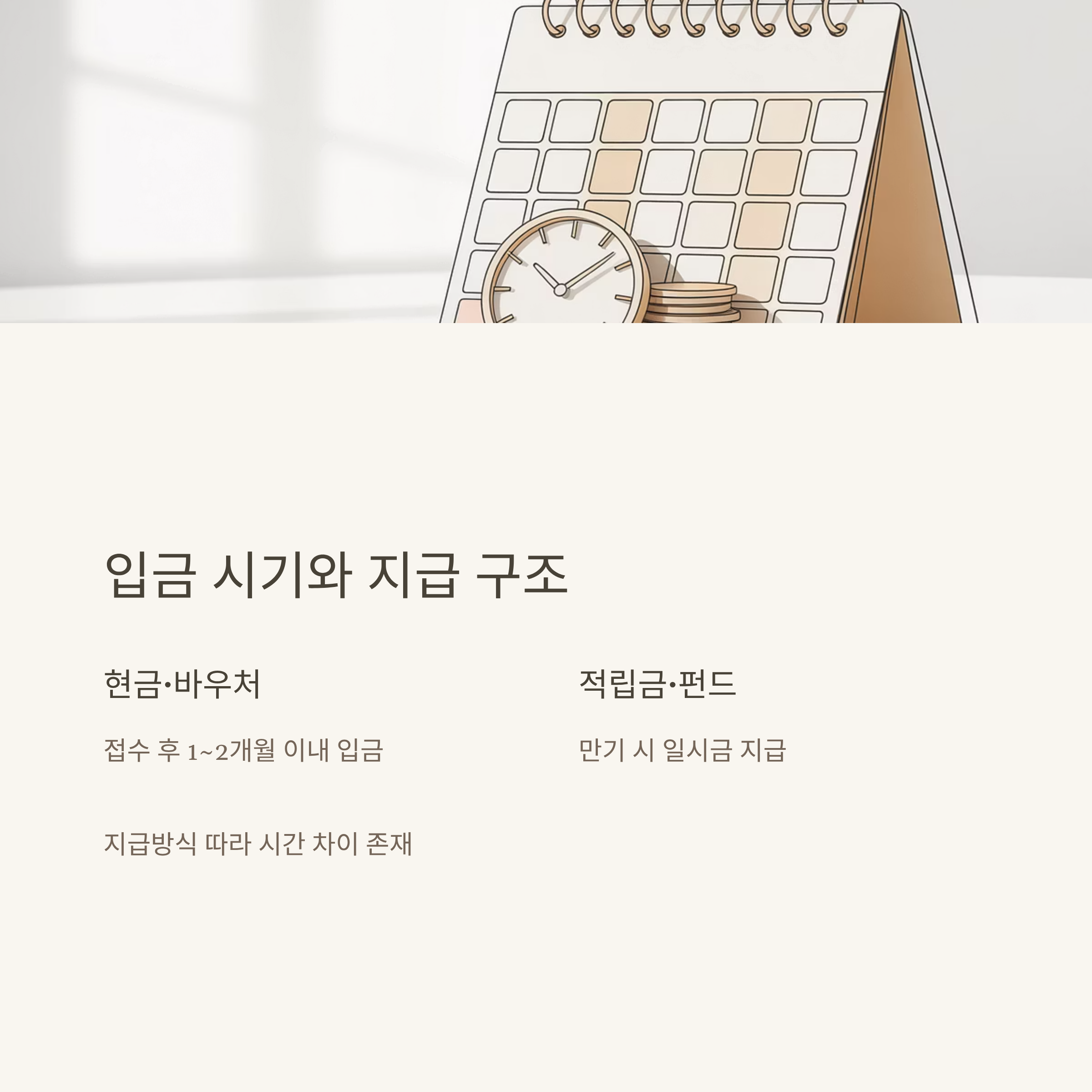 | 현금/바우처 | 접수 후 1~2개월 이내 | 계좌 입금/카드 등 지급 |