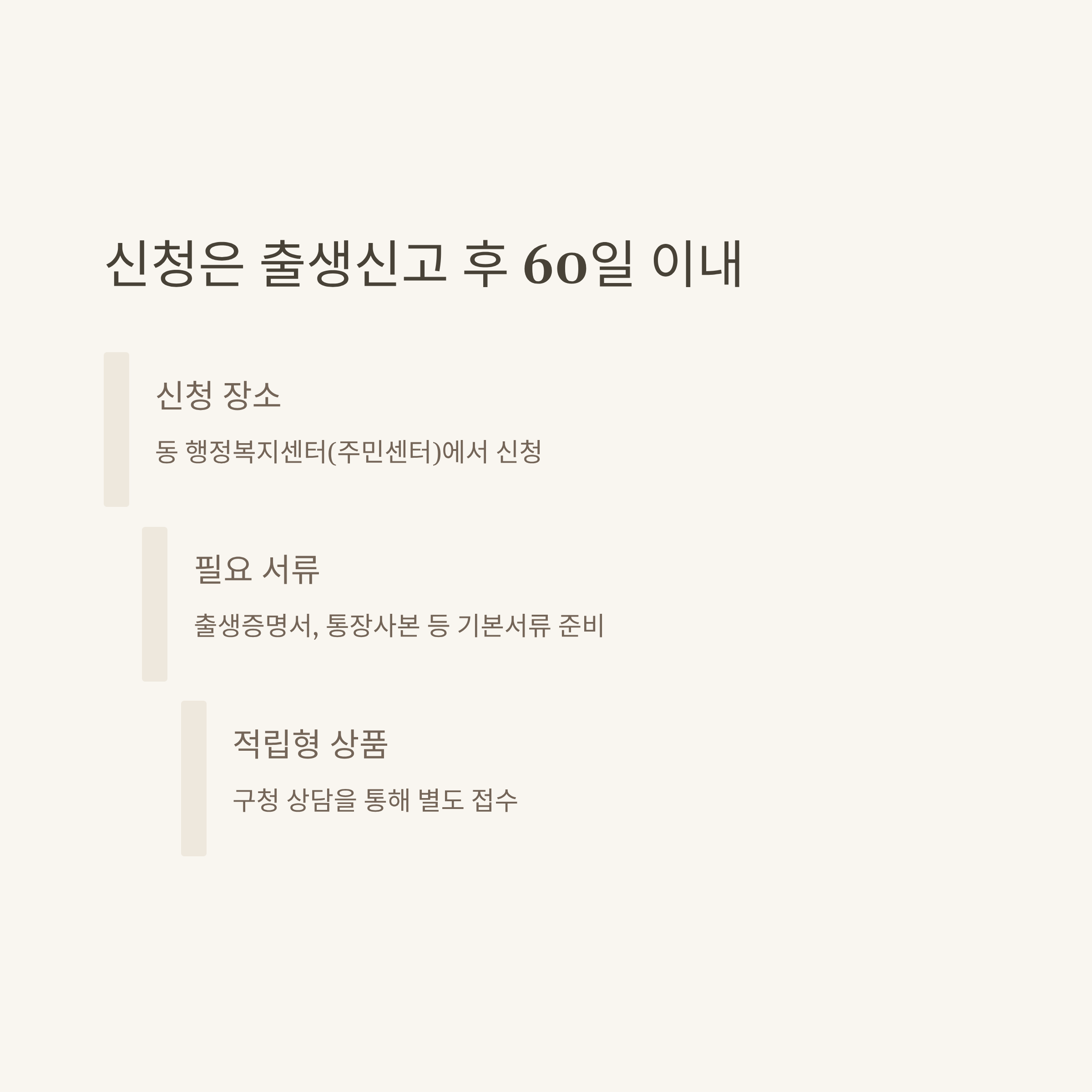 | 현금·바우처 | 출생증명서, 신분증, 통장사본 | 출생 후 60일 이내 | 동 행정복지센터 |