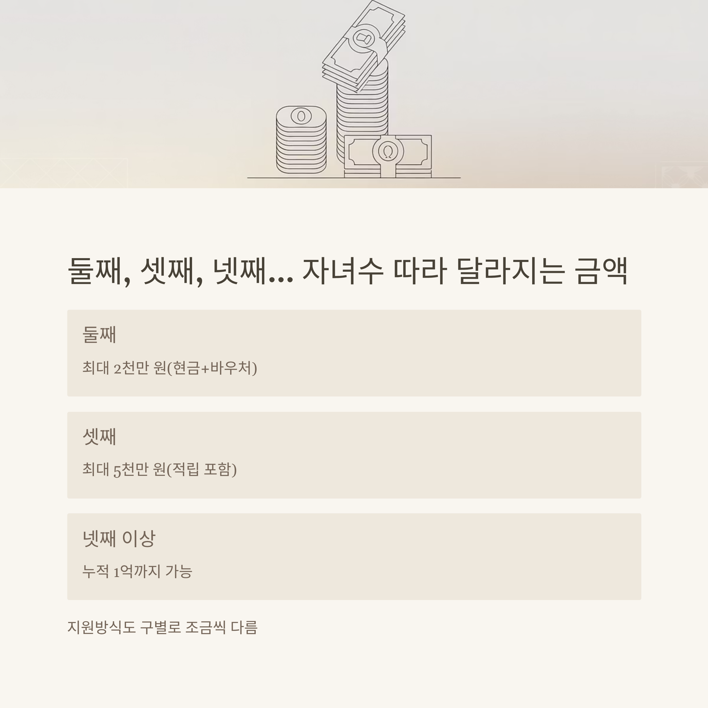 | 둘째 | 현금+바우처, 일부 적립식 | 최대 2,000만 원 |