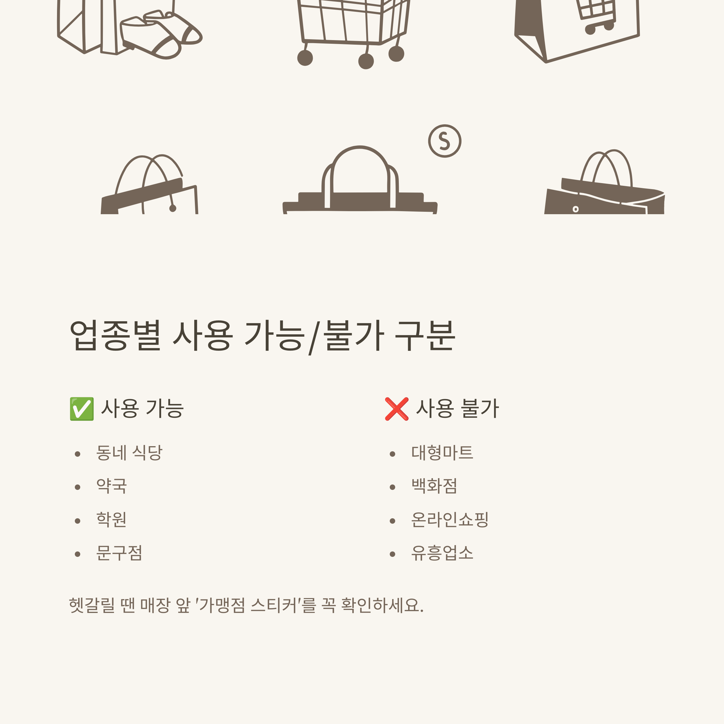 ‘왜 저기는 되고 여기는 안 되지?’ 저도 초반에는 사용처 구분이 헷갈렸습니다. 실제 결제 경험을 바탕으로, 어떤 업종이 결제 가능한지 표로 깔끔하게 정리해드립니다.
