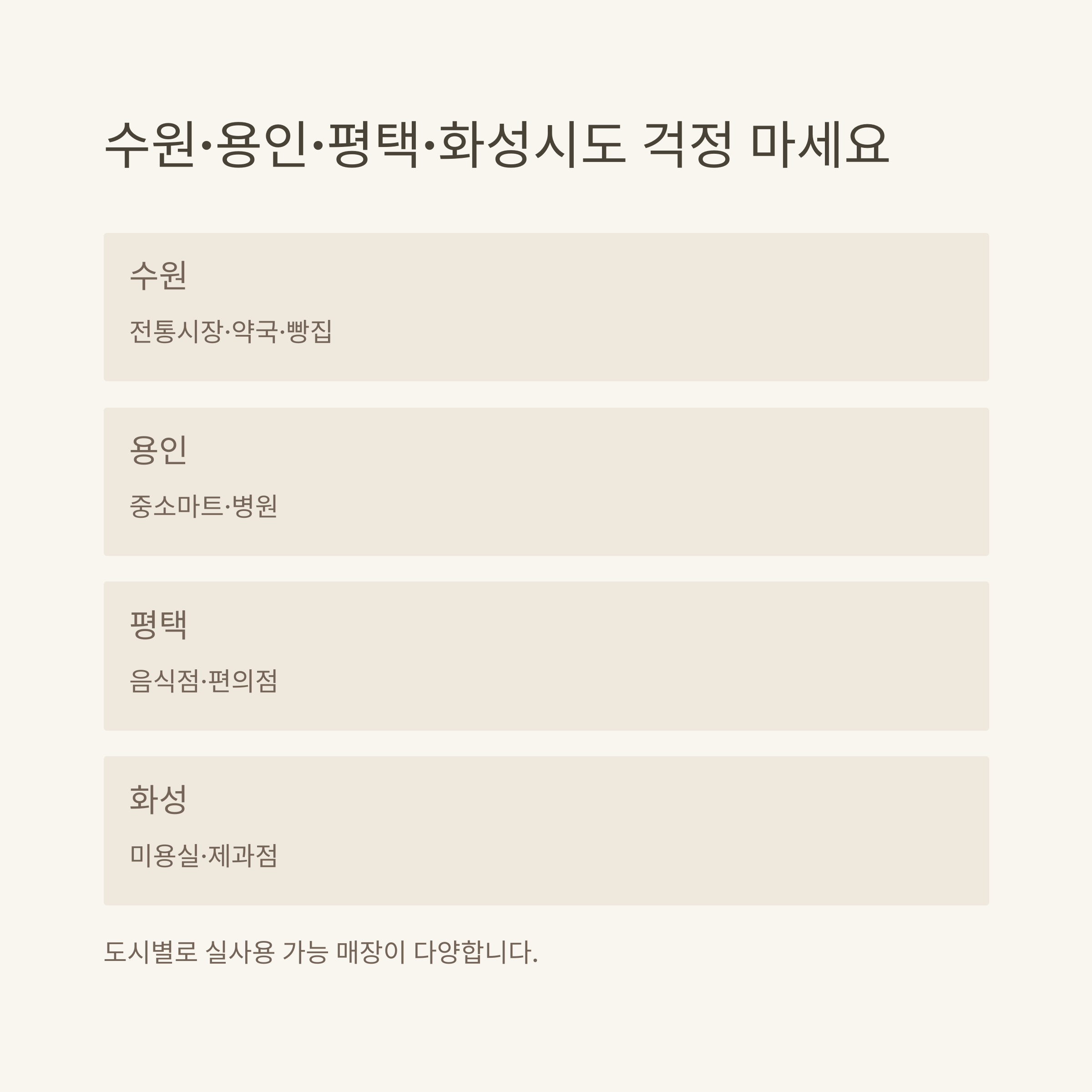 제가 거주지와 회사가 경기도권에 있어, 수원·용인·평택·화성시에서 모두 지역화폐를 직접 사용해봤습니다. 도시별로 가맹점이 약간씩 다르지만, 핵심은 동네 소상공인·전통시장·중소매장 위주로 결제가 가능하다는 점입니다.