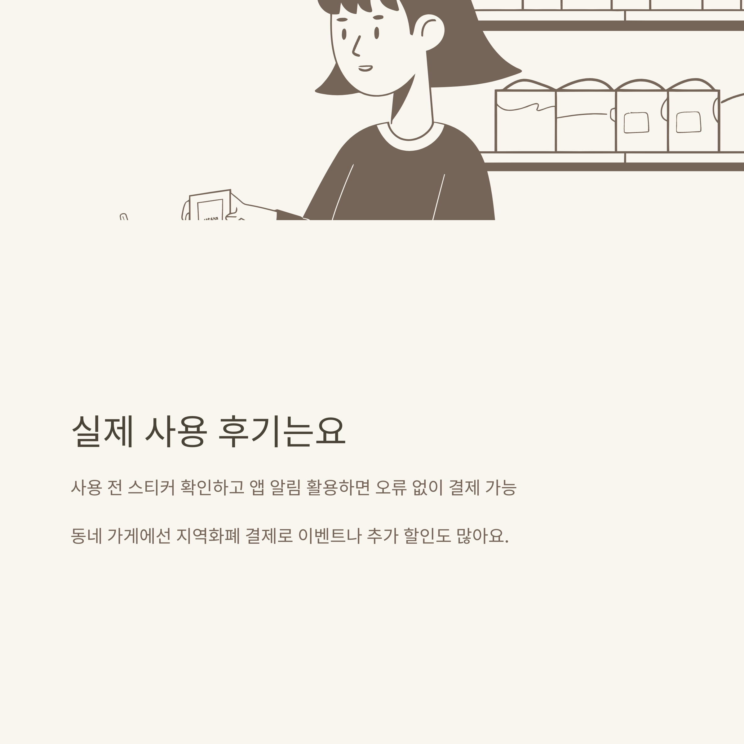 - 결제 전 ‘가맹점 안내 스티커’ 확인이 필수: 현관문·카운터 부근에 지역화폐 가능 스티커가 붙어있으면 거의 100% 결제 가능했습니다.