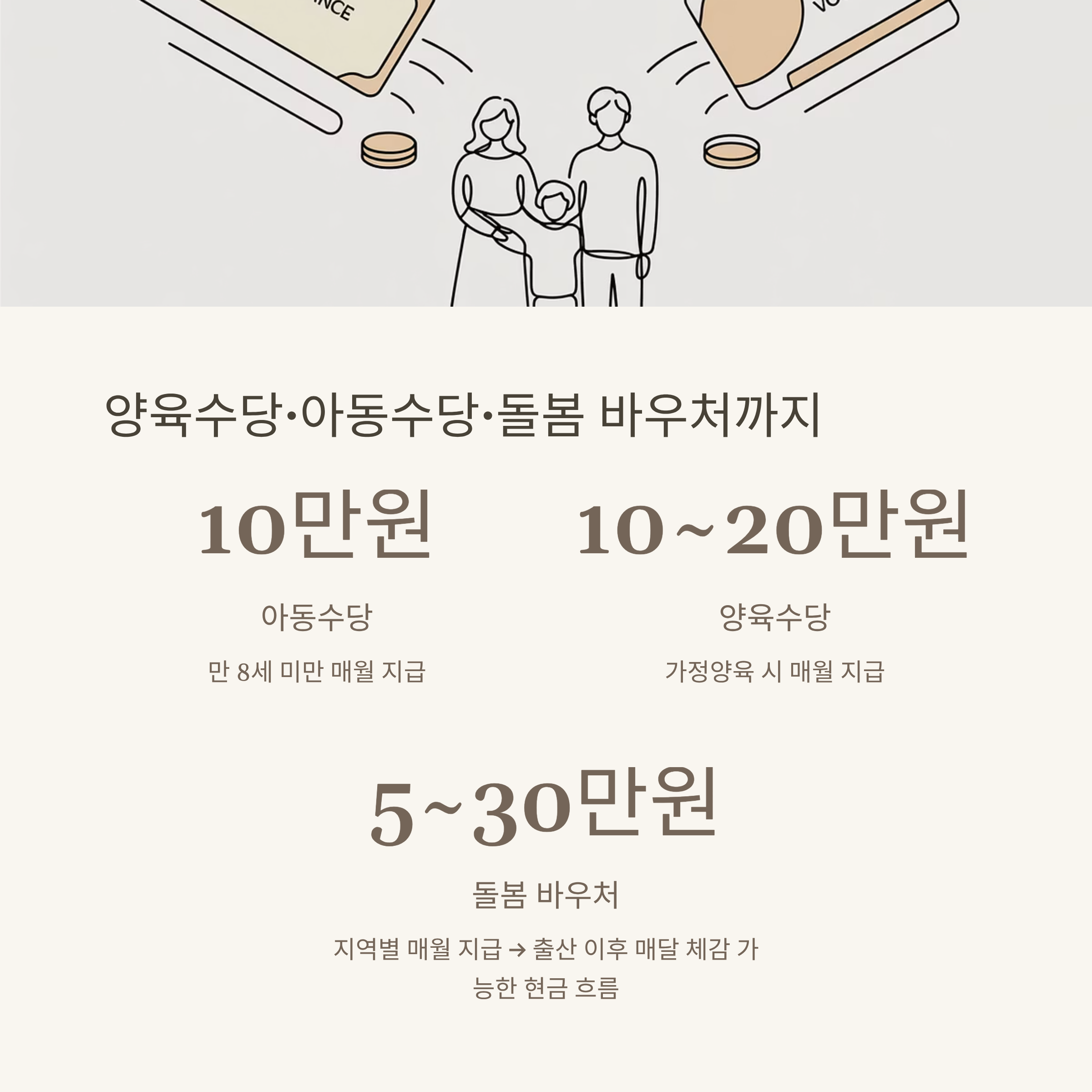 | 양육수당/아동수당 | 매월 10~20만원(영유아, 만 8세 미만) |