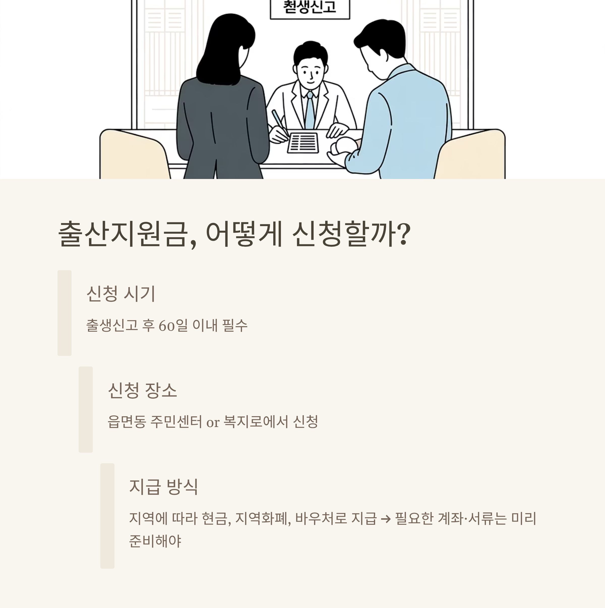 | 출생신고 | 출생 후 1개월 이내 필수 | 신청 빠를수록 지급도 빠름 |