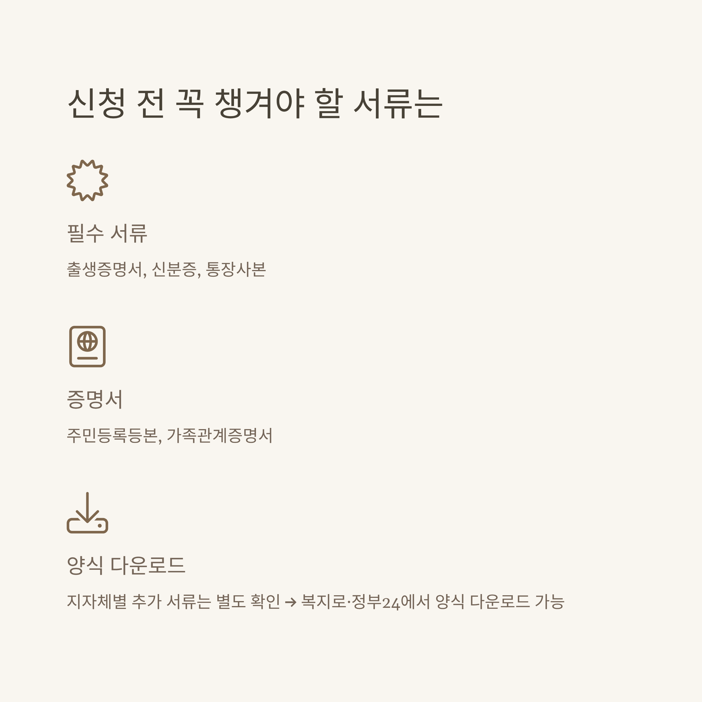 | 양육·아동수당 | 주민등록등본, 신분증, 계좌 | 거주지별 서류 추가 확인 |