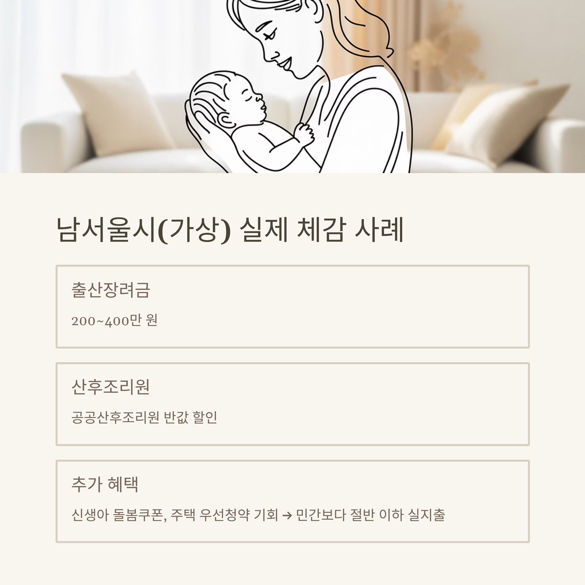 | 산후조리비 | 50만원 바우처 | 추가 건강검진·영유아용품 지원 |