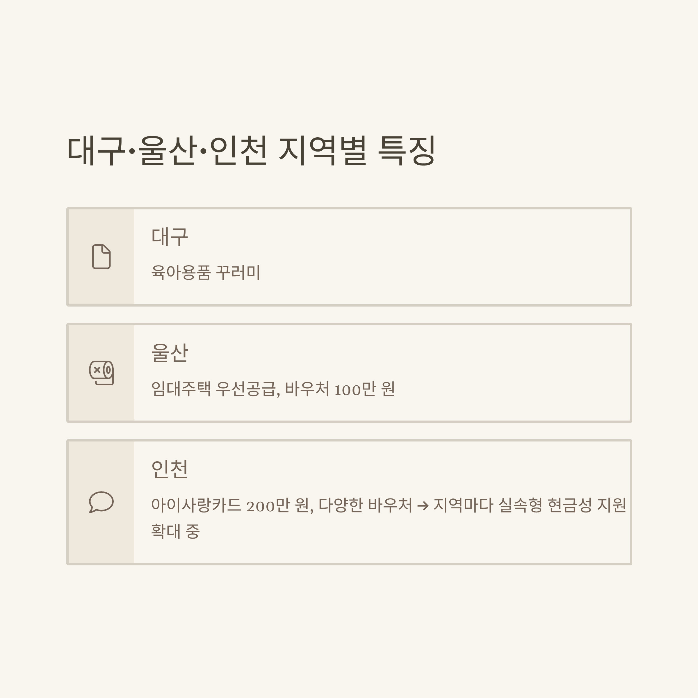 각 광역시별로도 출산지원금과 바우처, 실질적인 현금성 지원이 상향되고 있는 추세입니다. 제가 대구·울산·인천에서 실제로 지원받거나 주변 지인들이 수령했던 내용을 토대로 정리하면, 출산지원금(1인당 100~300만원), 산후조리비, 산모·신생아 건강관리(바우처 90~120만원 상당), 출산가구 전용 대출 지원, 그리고 아동수당·양육수당까지 비교적 폭넓게 제공되고 있습니다. 특히 인천은 ‘아이사랑카드’ 등 별도의 현금성 카드 지급, 대구는 육아용품 꾸러미, 울산은 산모 바우처와 함께 출산가정 공공임대주택 우선권도 함께 지급하는 점이 특징입니다.