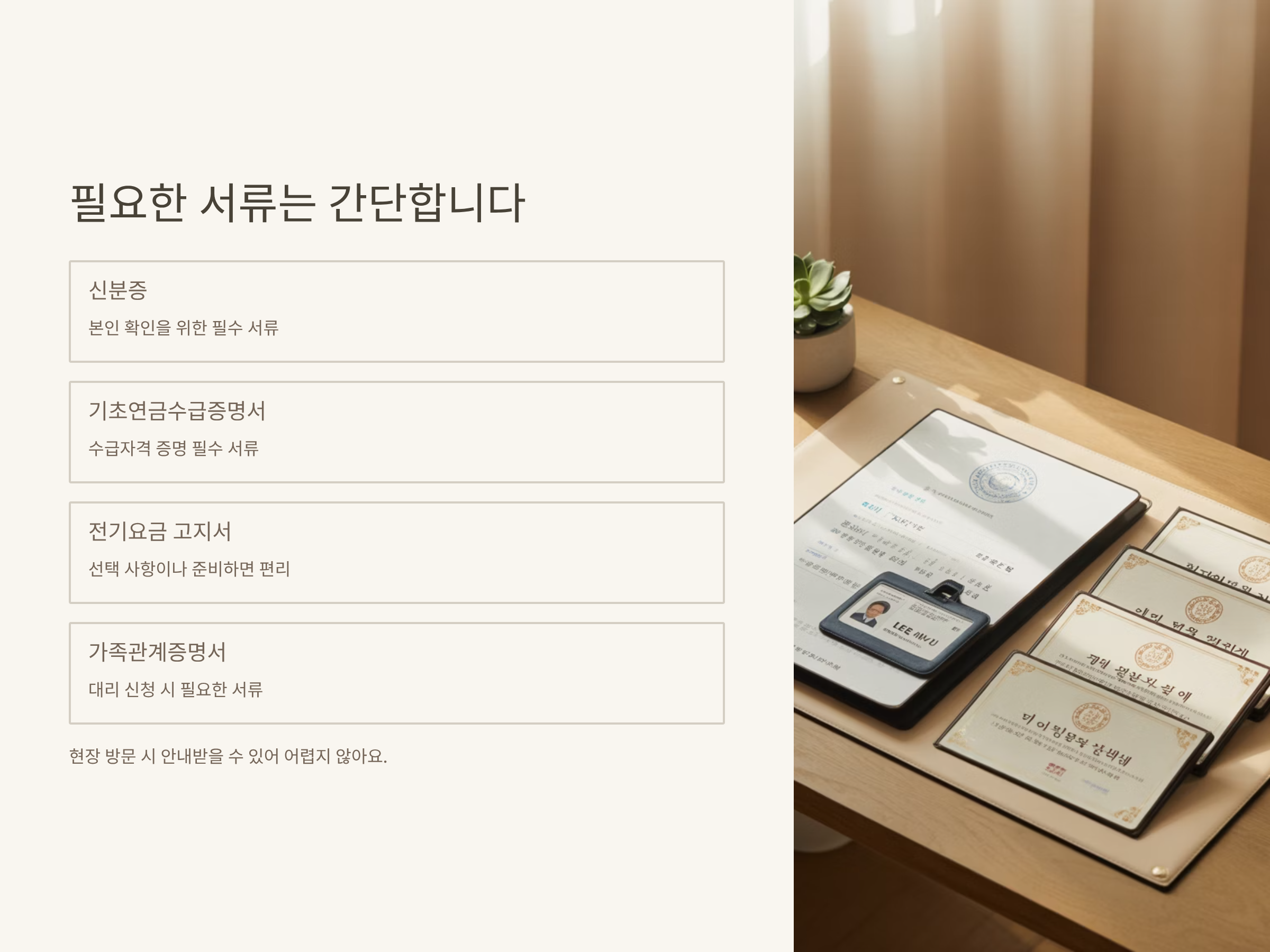 할인 신청을 준비하며 “뭐가 필요하지?” 고민이 많으셨죠. 저희 부모님도 직접 준비해보니 실제로 필요한 서류는 아주 간단했습니다. 기본적으로 신분증과 기초연금수급증명서(또는 복지수급 증빙서류)만 있으면 충분했습니다.